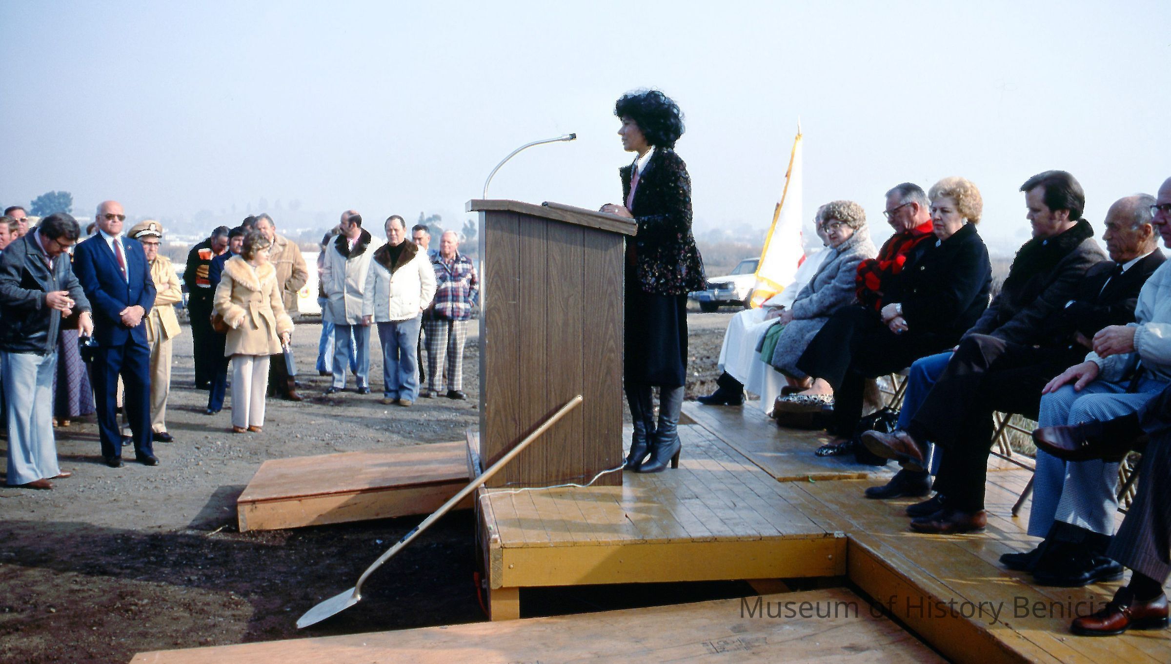 Color slide of woman speaking at dedication of Benicia Marina.