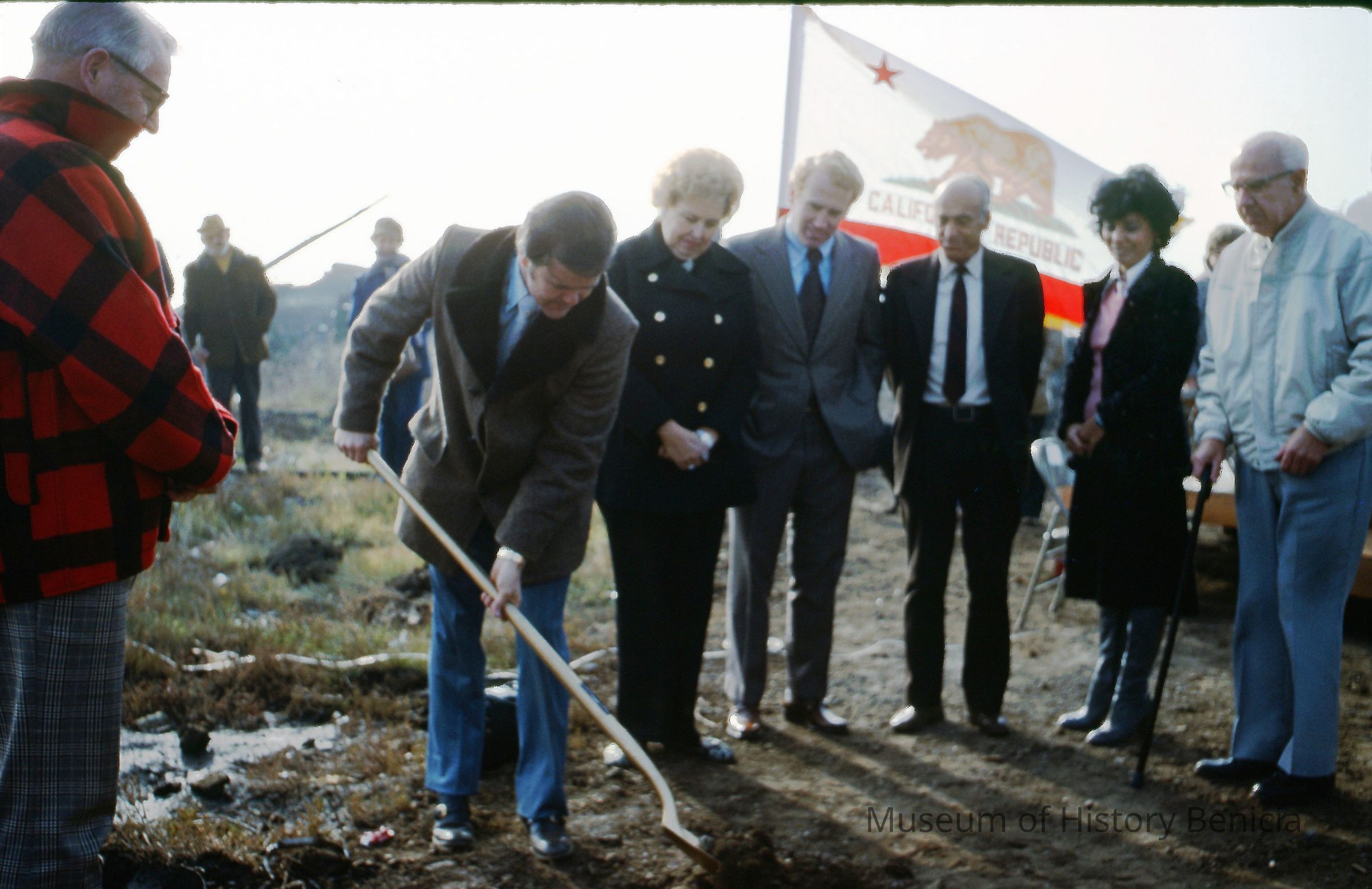Color slide of Major Warren O'Blennis turning ground w/shovel (ceremonial-gold?) at dedication of Benicia Marina.