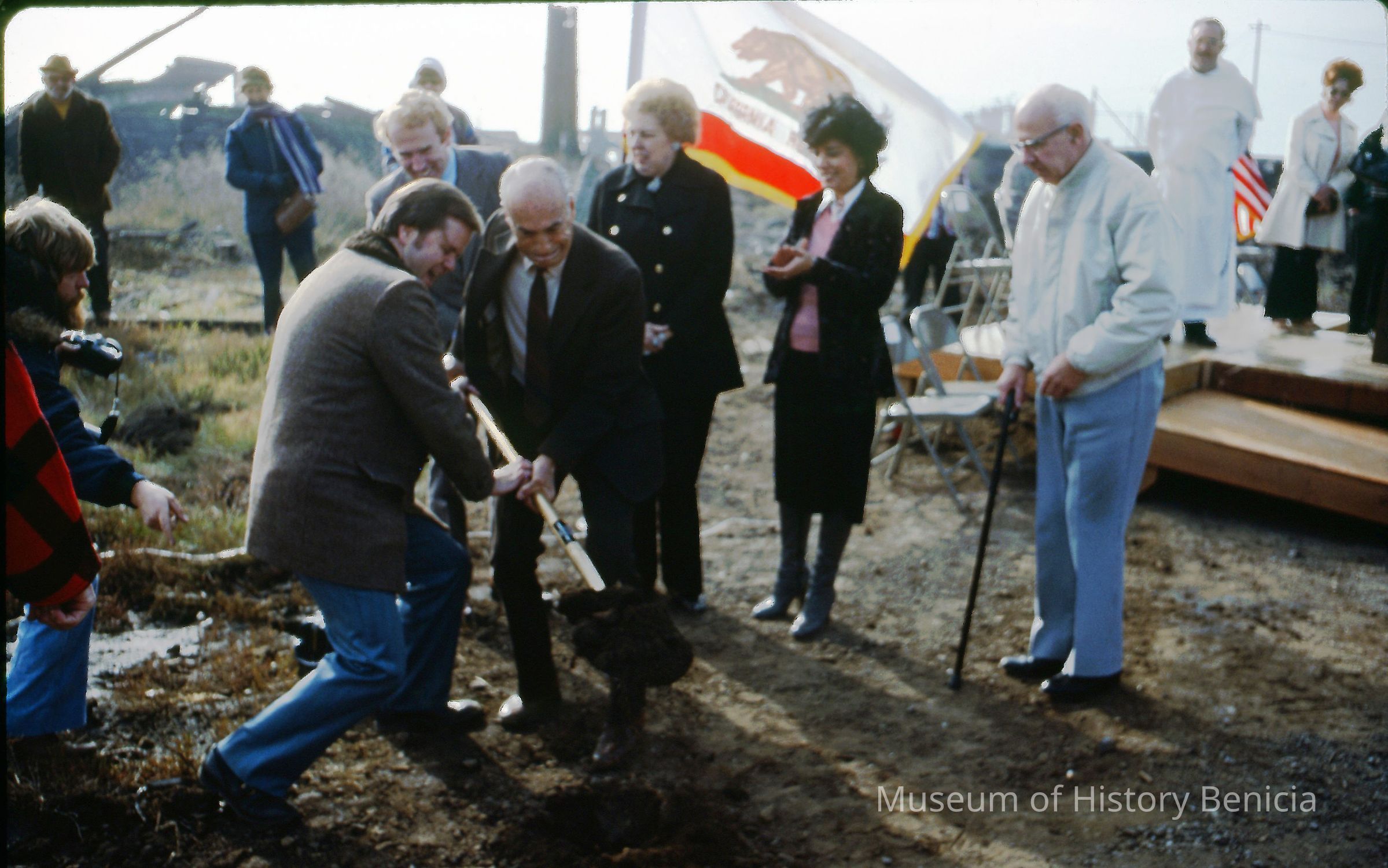 Color slide of Mayor Warren O'Blennis and another man (possibly James Lemos) w/ceremonial shovel at dedication of Benicia Marina.Collection