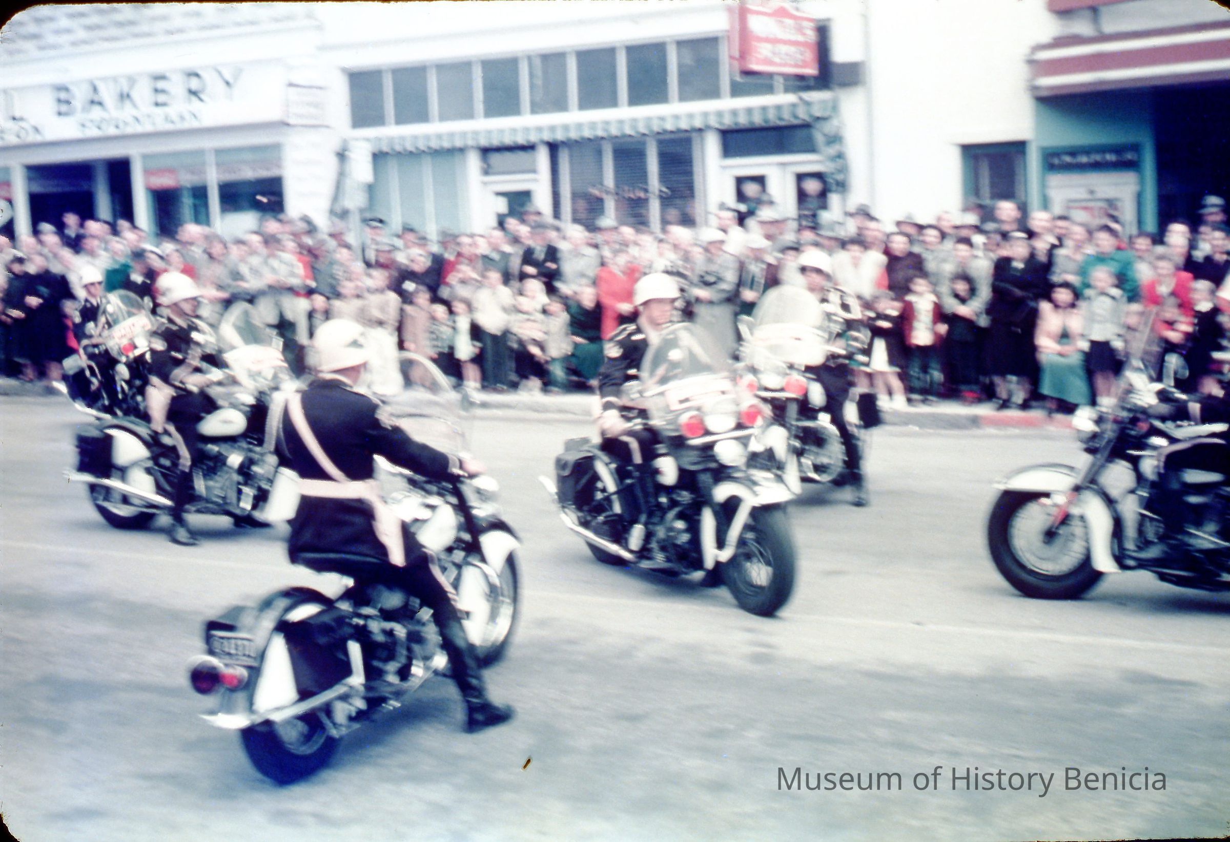 Color slide of motorcycle police drill team in parade on First Street near Royal Bakery in front of State Theater (partial marque showing).Collection