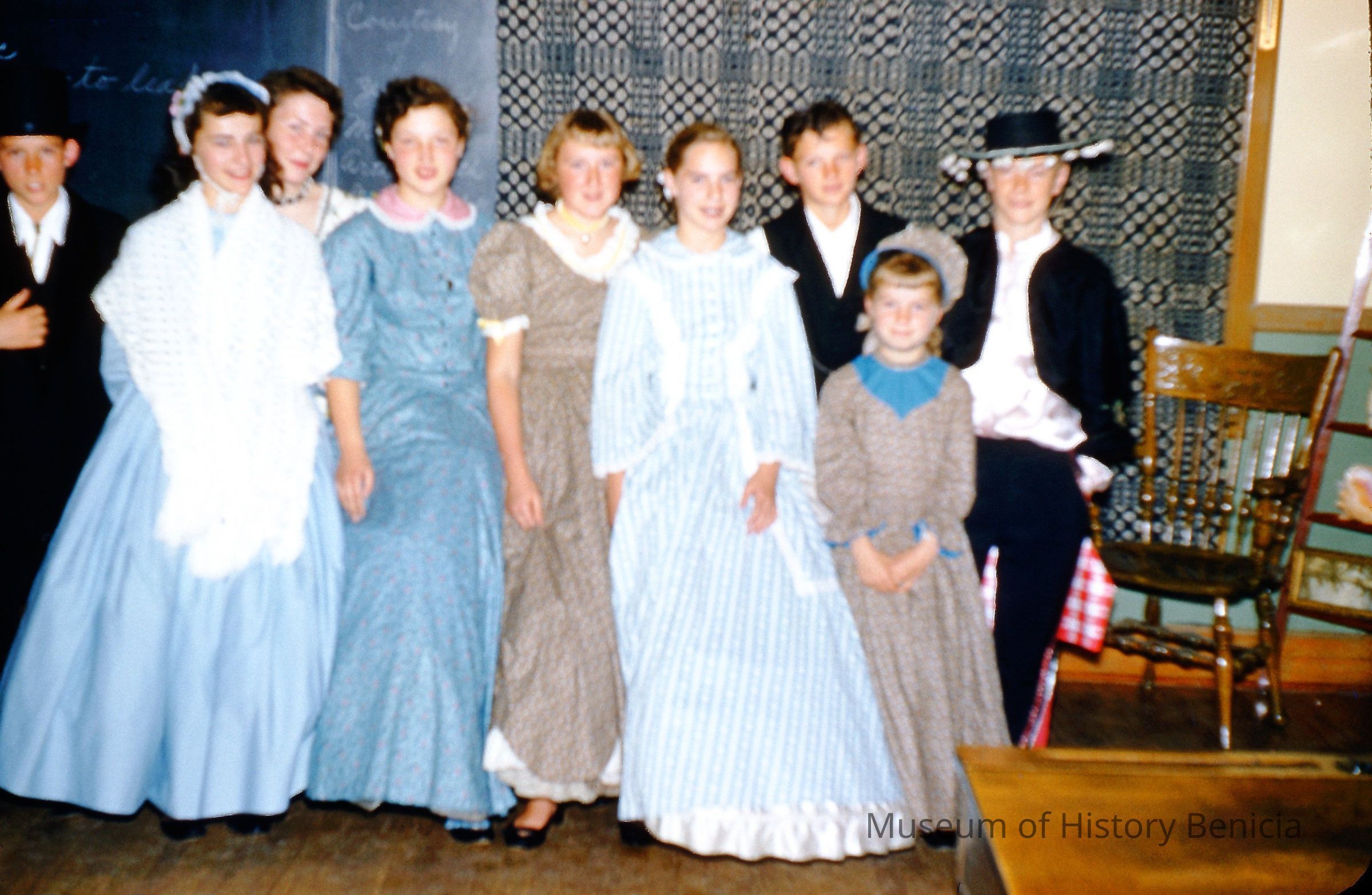 35mm Color Slide: costumed school children who participated in the rededication of the Benicia State Capitol; students from left: Ed Kaspar, Judy Core, Barbara Wilcox, Sara Rexroat, Donna Shipman, Judy Wagner, Wayne Llewellen, unknown, unknownCollection