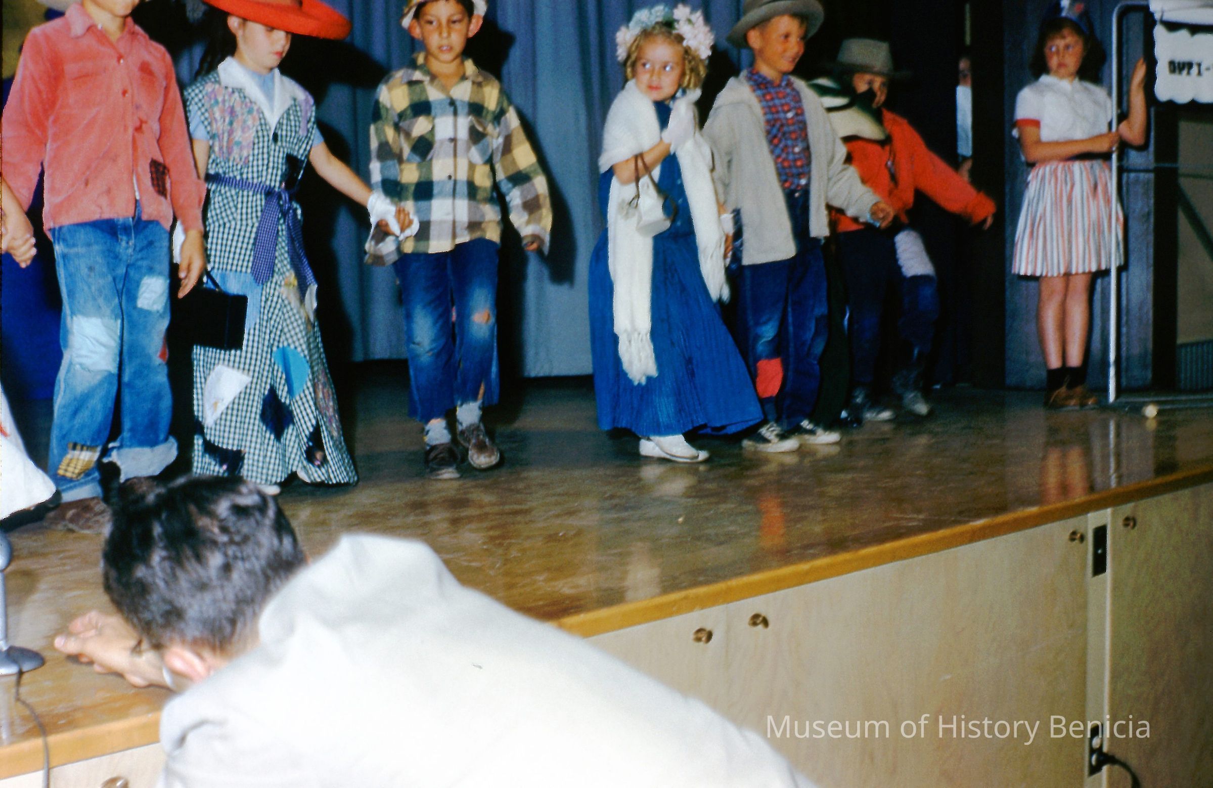 35mm Color Slide: costumed school children who participated in the rededication of the Benicia State Capitol; a small group of unidentified students performs on stage at a schoolCollection
