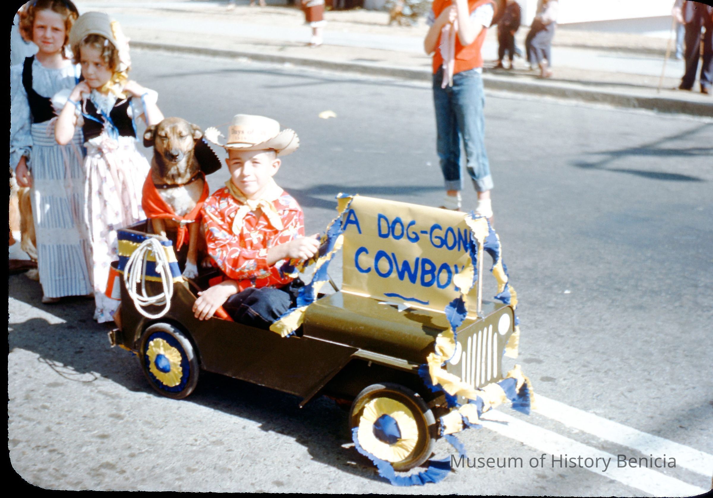 A young man and his dog are seated in a wagon decorated to look like an Army Jeep. A sign on the front says "A Dog-Gon Cowboy". Two young ladies in old-fashioned dresses stand behind the "Jeep".Collection