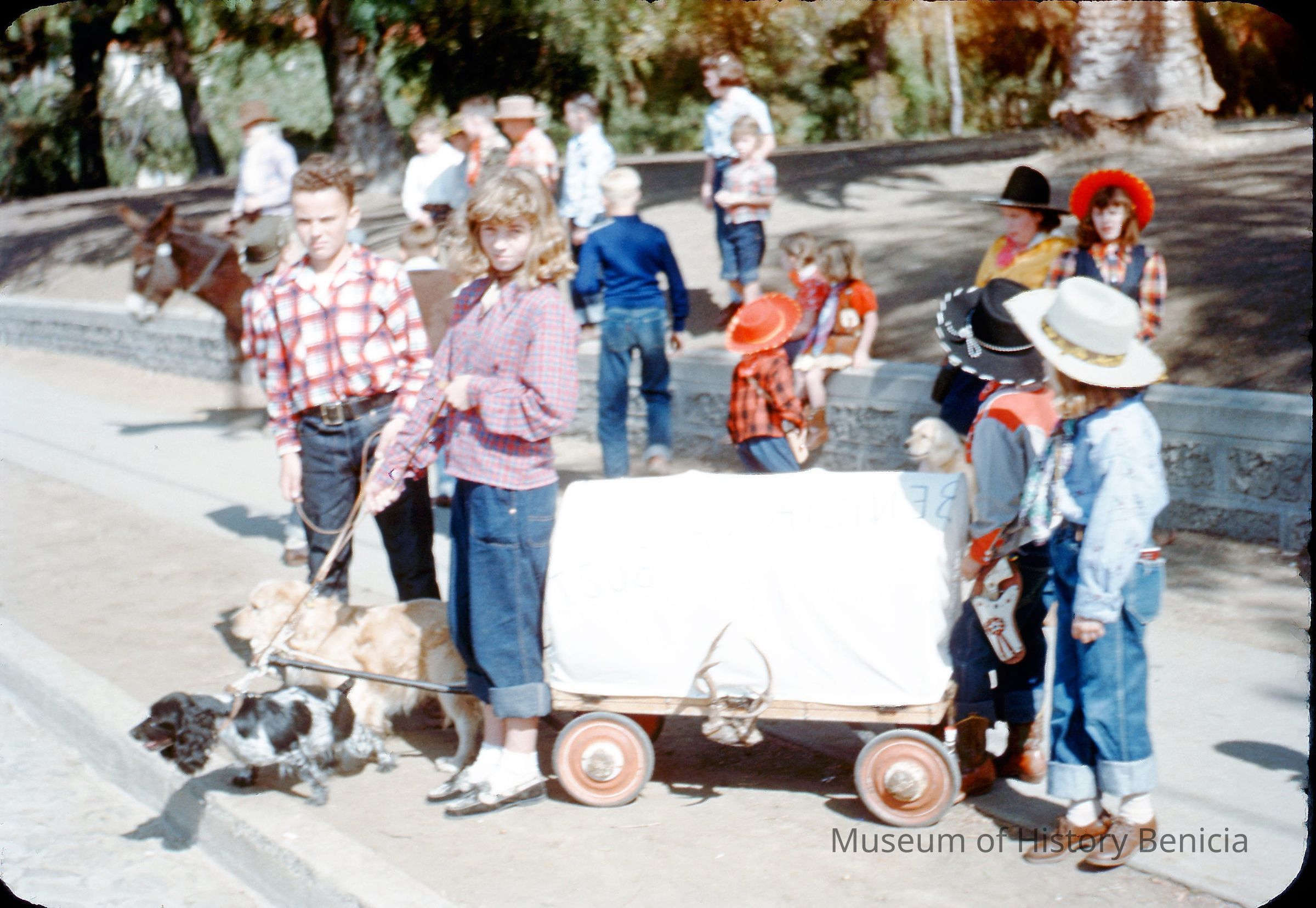A group of young people are standing near a red wagon that has been altered to look like an old covered wagon. The words "Benicia or Bust" are written on the side of the cloth. The wagon is being pulled by two dogs with the help of two of the older children. A man in the background is sitting on a mule.Collection