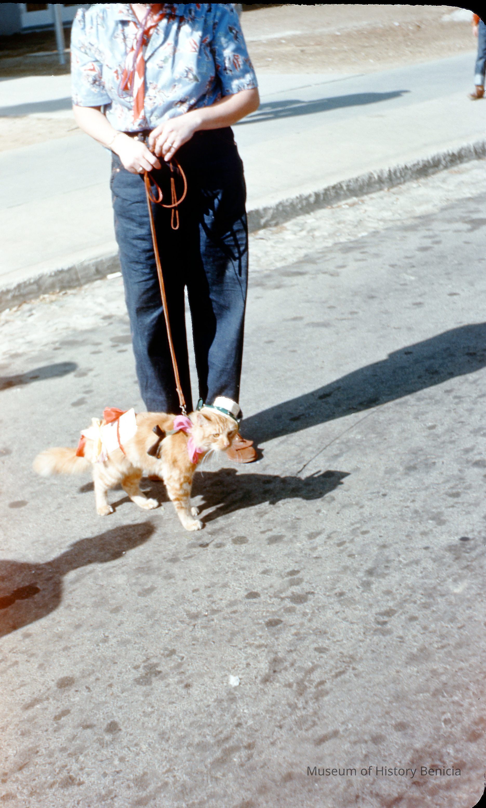 A person who's head is out of the picture frame stands next to a pet cat on a leash.Collection