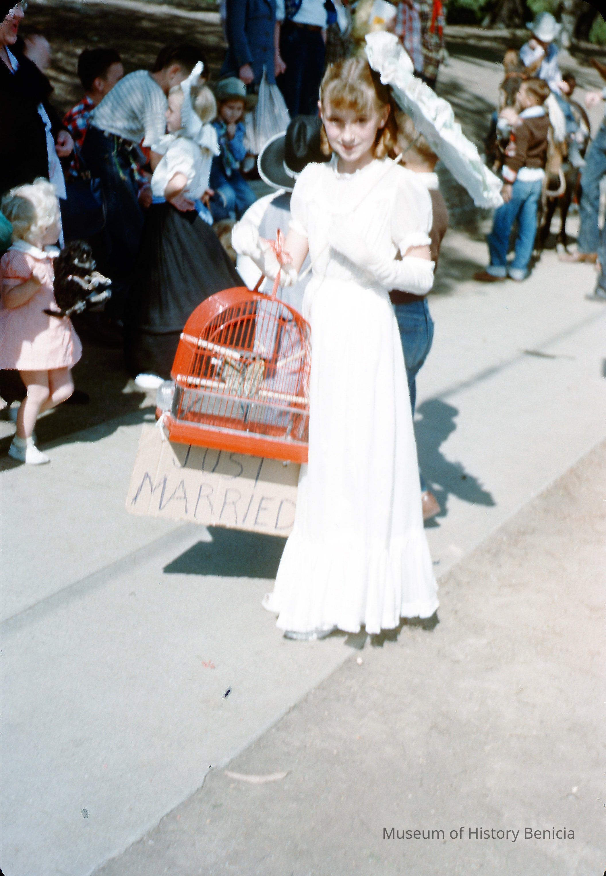 A young girl is wearing an old-fashioned white dress. She holds a parasol in her left hand and a red bird cage with two parakeets in it in her right hand. A sign "Just Married" hangs from the bottom of the cage.Collection