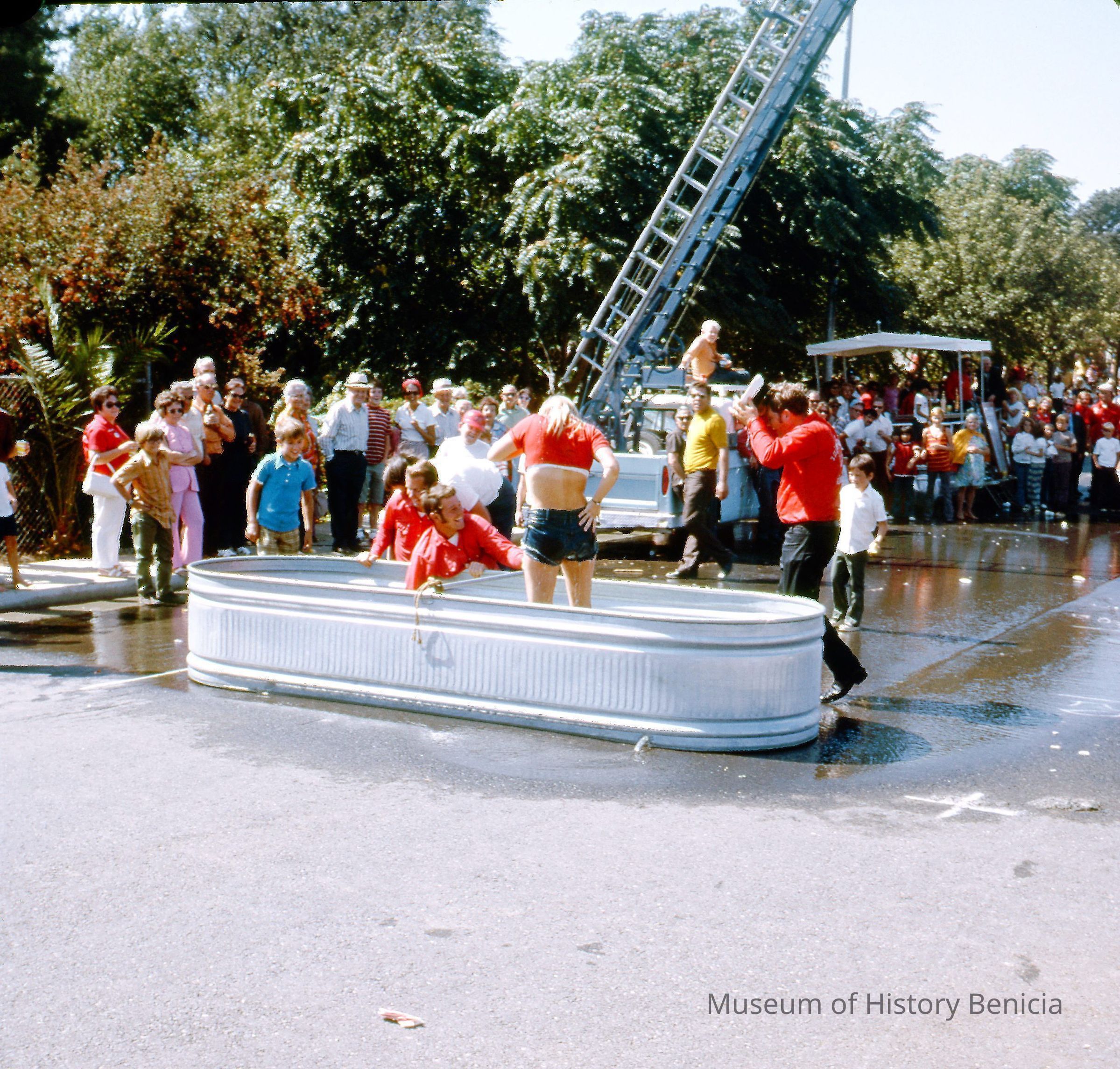 Shown are firemen letting off steam in and around the water tub used in the water shooting contest while people are milling around on East L Street before the new library was built.Collection