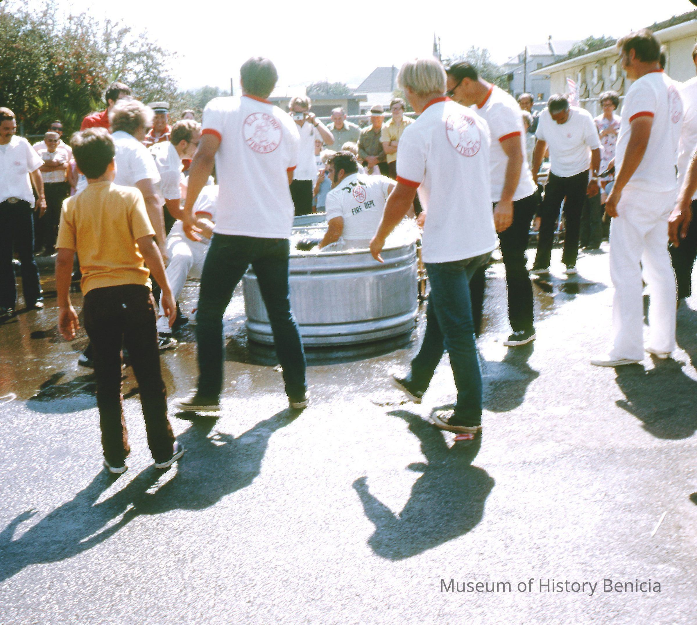 Shown are firemen letting off steam in and around the water tub used in the water shooting contest while people are milling around on East L Street before the new library was built.Collection