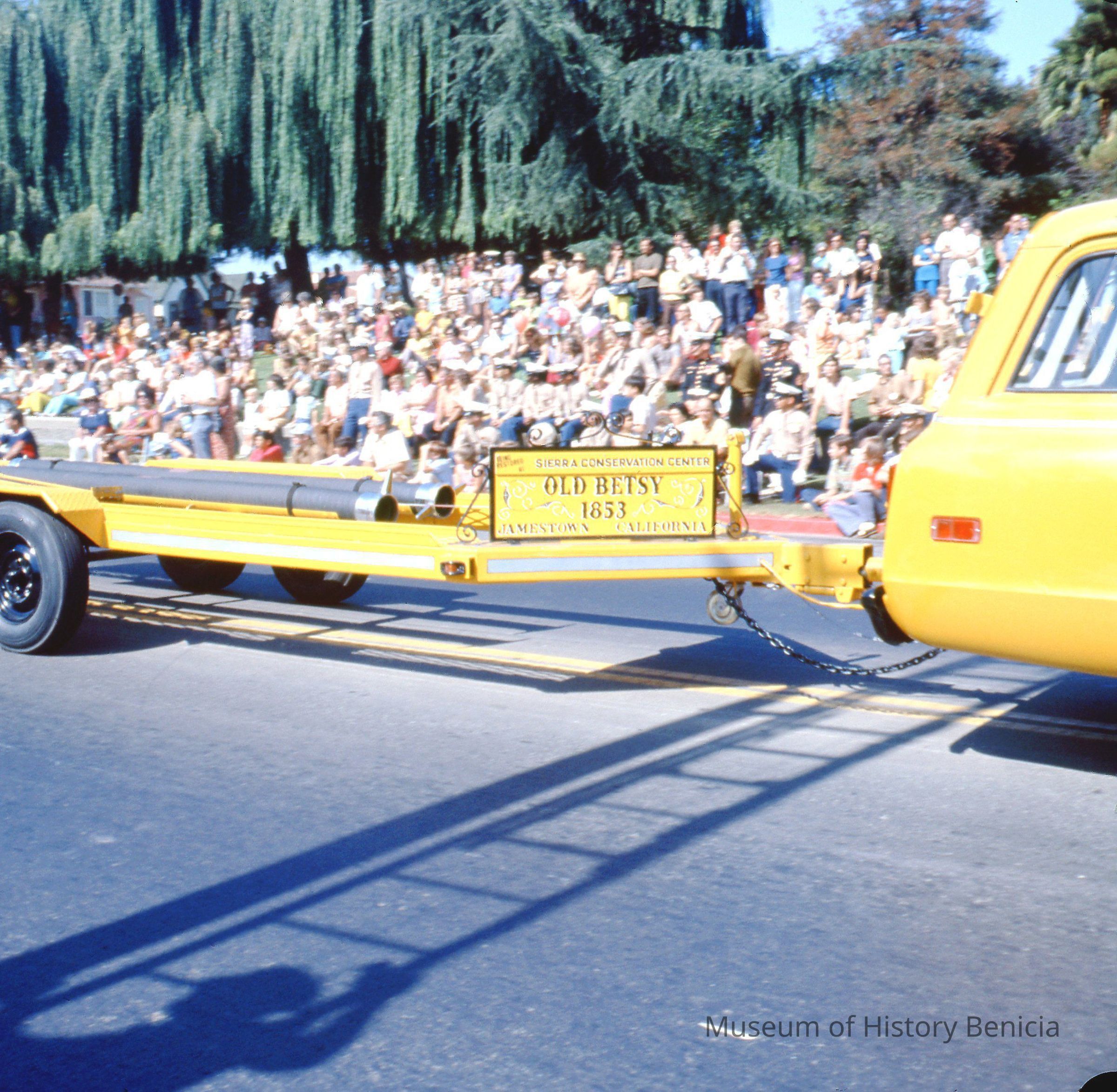 Shown is a truck pulling a trailer from the Sierra Conservation Center in Jamestown, a sign reading "Old Betsy 1853" is on the trailer, in the parade as it passes City Park.Collection