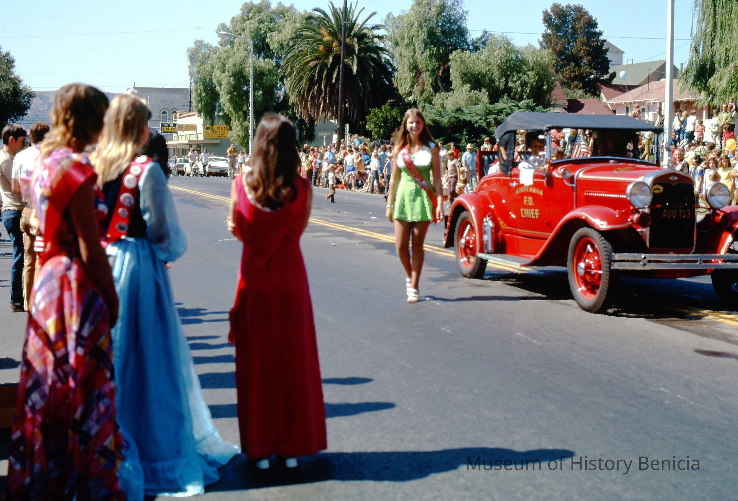 Shown is an antique fire department automobile moving away from the judges' stand after letting one of the queen's court out to view the parade near the stand across from the City Park. The young lady is walking towards the other members of the court.Collection