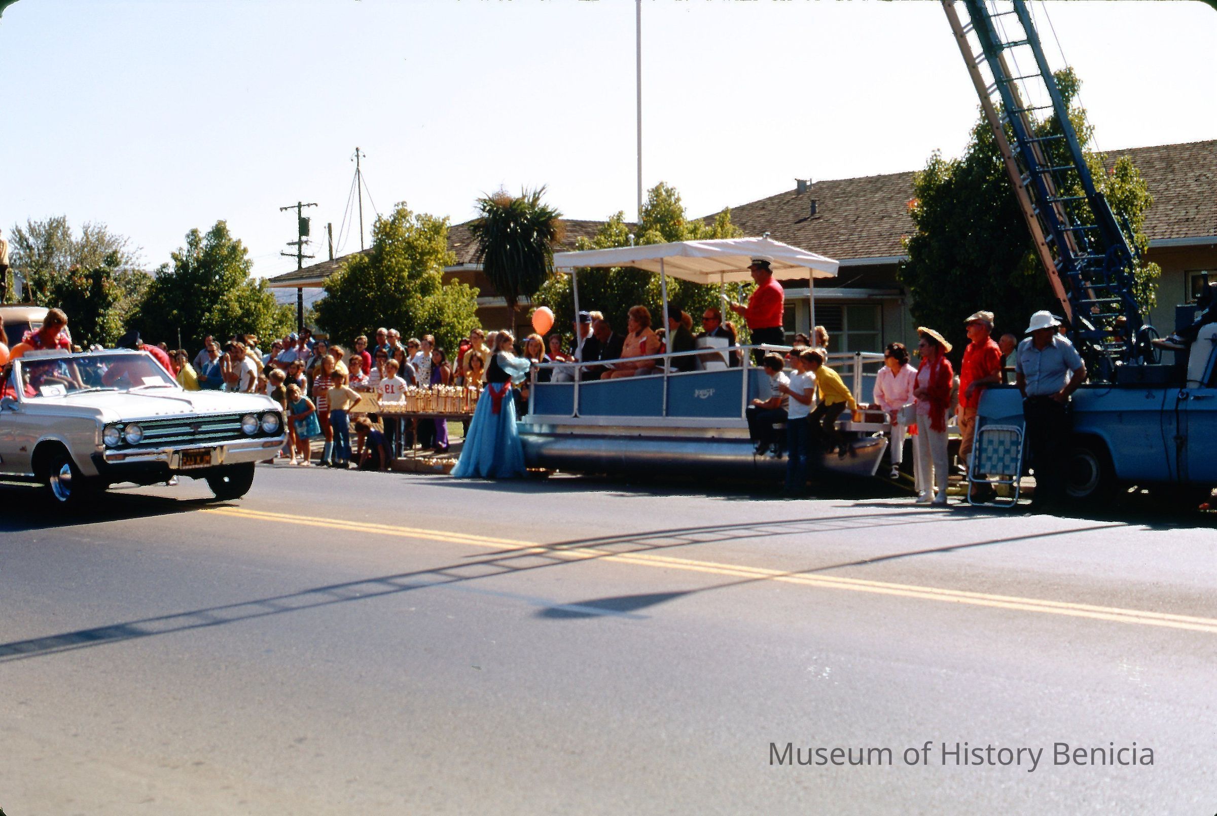 Shown is a convertible automobile stopping next to the judges' stand letting the queen and her court get out to view the parade near the stand across from the City Park.Collection