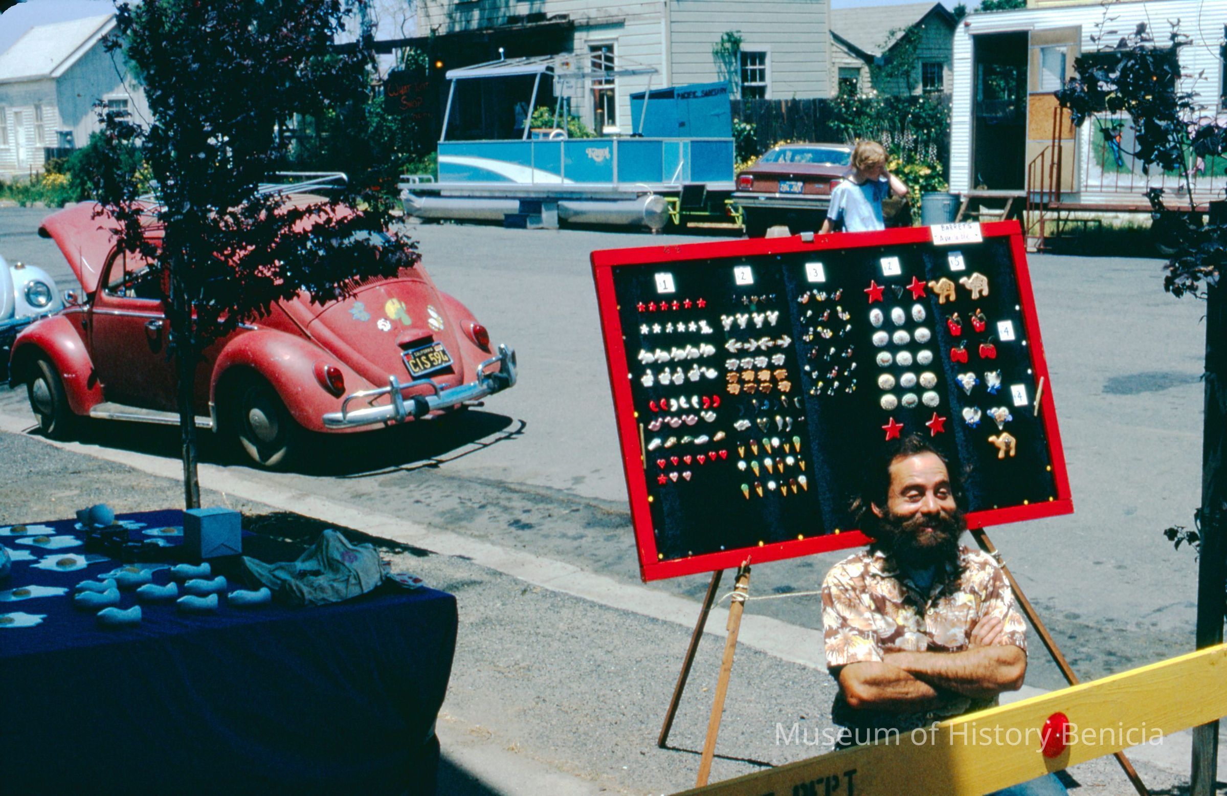 35mm Color Slide: Promotion for Art Center held on First Street Benicia: shows a display of pins or buttons on a board on the sidewalk of West D Street ; a man is seated in front of the board and he may be the artist/creator of the items (just south of the Union Hotel) a food trailer can be seen in the backgroundCollection
