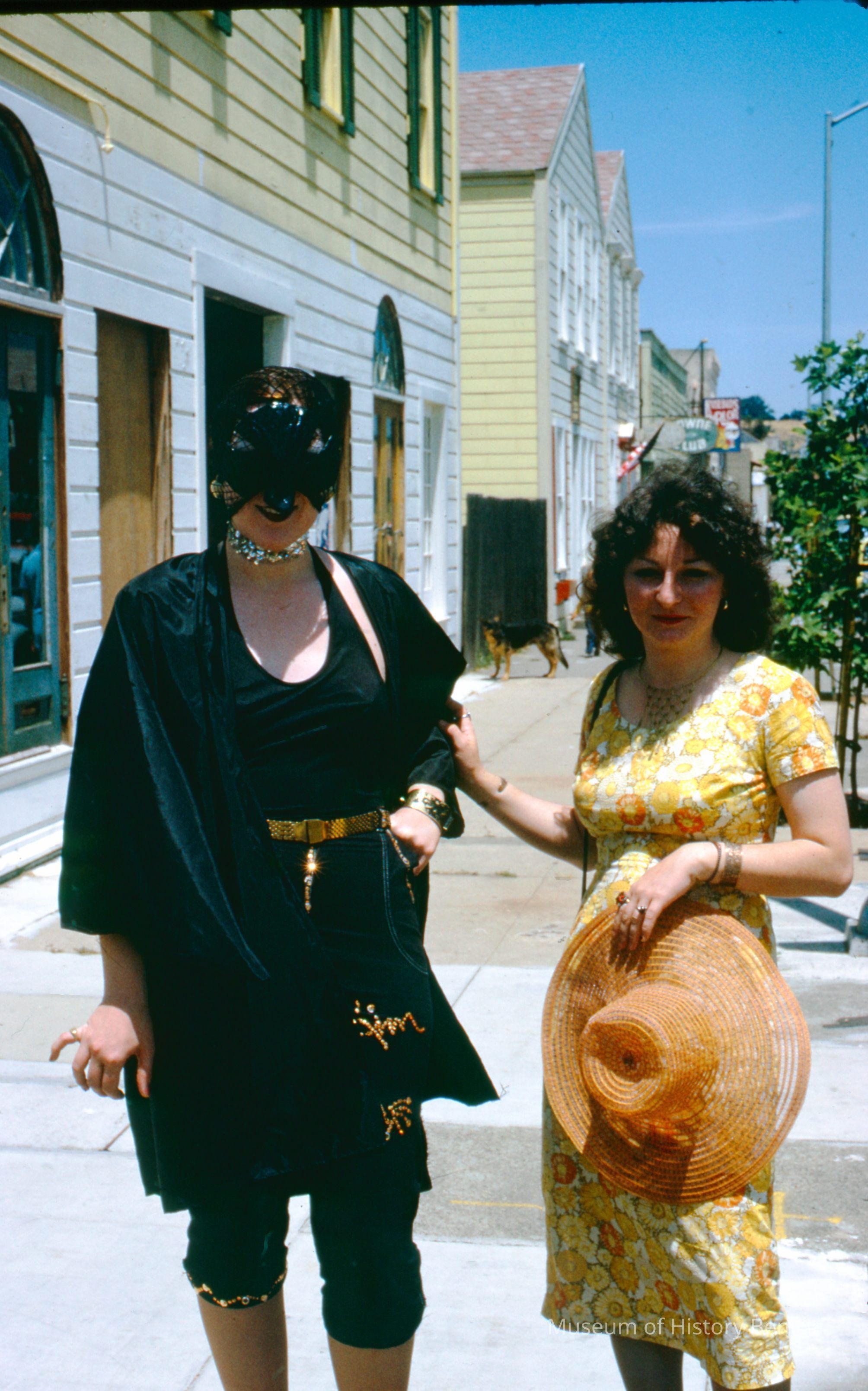 35mm Color Slide: Promotion for Art Center held on First Street Benicia: shows two women (the one on the left is wearing a mask) standing in front of the Union Hotel which is going renovation at the timeCollection