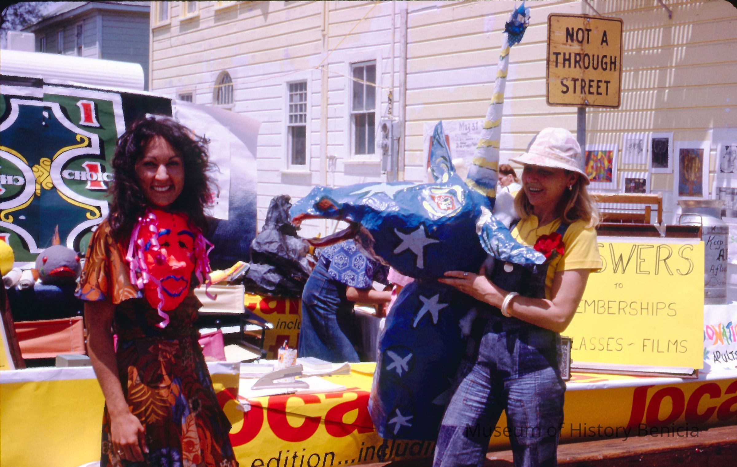 35mm Color Slide: Promotion for Art Center held on First Street Benicia: shows two women with papier mache art standing in front of a table with information about art classesCollection