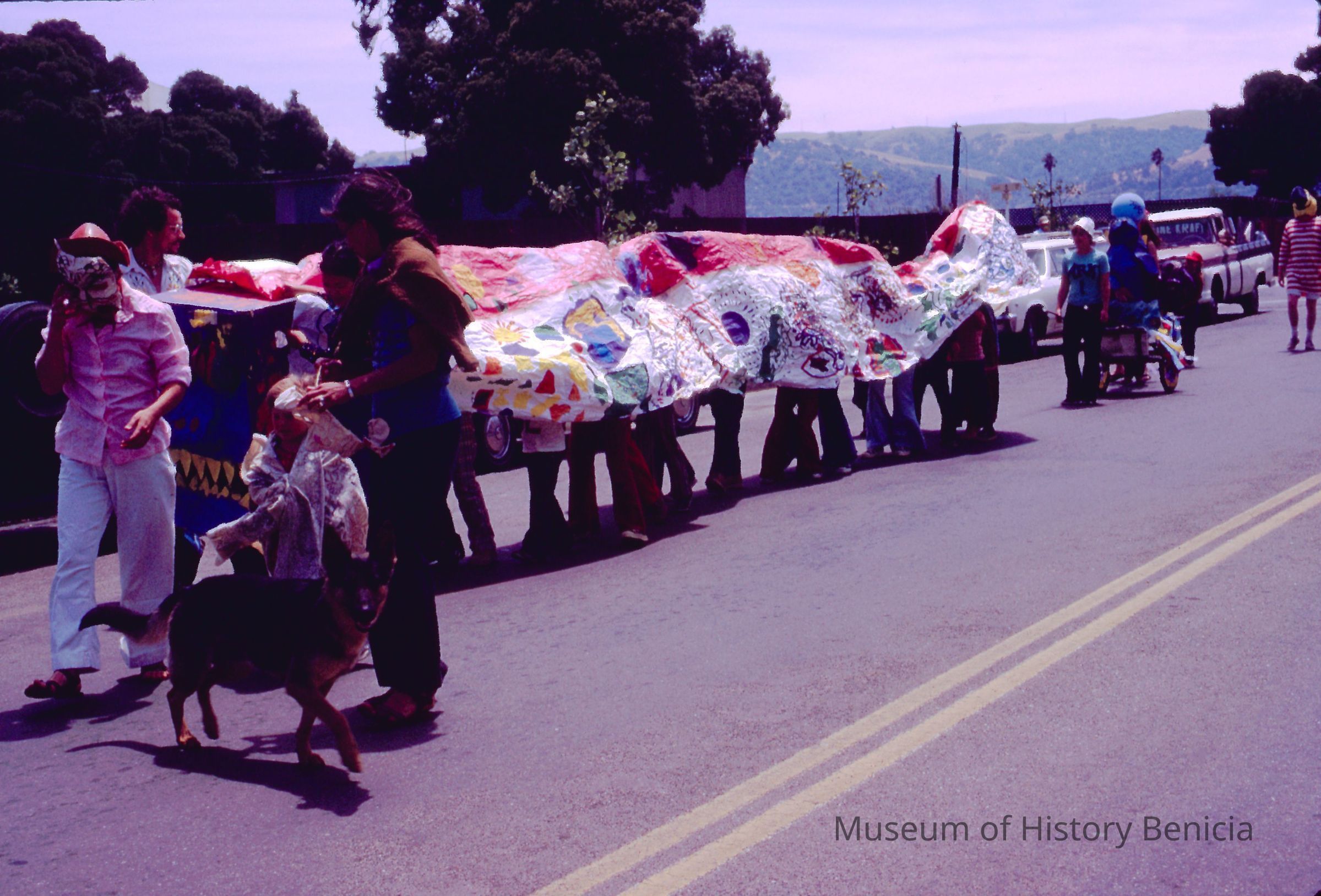 35mm Color Slide: Promotion for Art Center held on First Street Benicia: shows a parade of people on First Street with papier mache heads; one is a multi-person dragonCollection