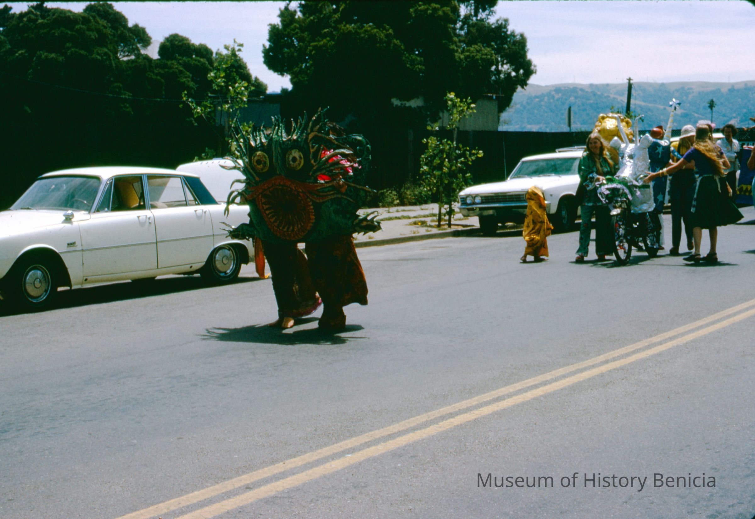 35mm Color Slide: Promotion for Art Center held on First Street Benicia: shows a parade of people on First Street with papier mache heads (they are in front of Lavezzo's Wrecking Yard (East Side of the street at the time)Collection