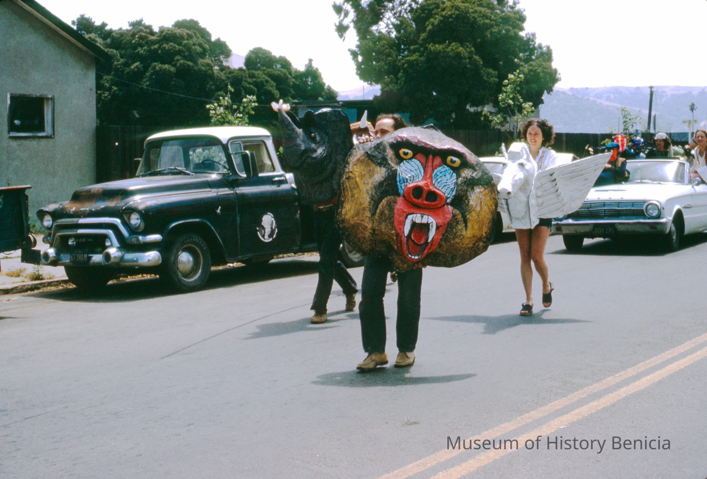 35mm Color Slide: Promotion for Art Center held on First Street Benicia: shows a parade of people on First Street with papier mache headsCollection