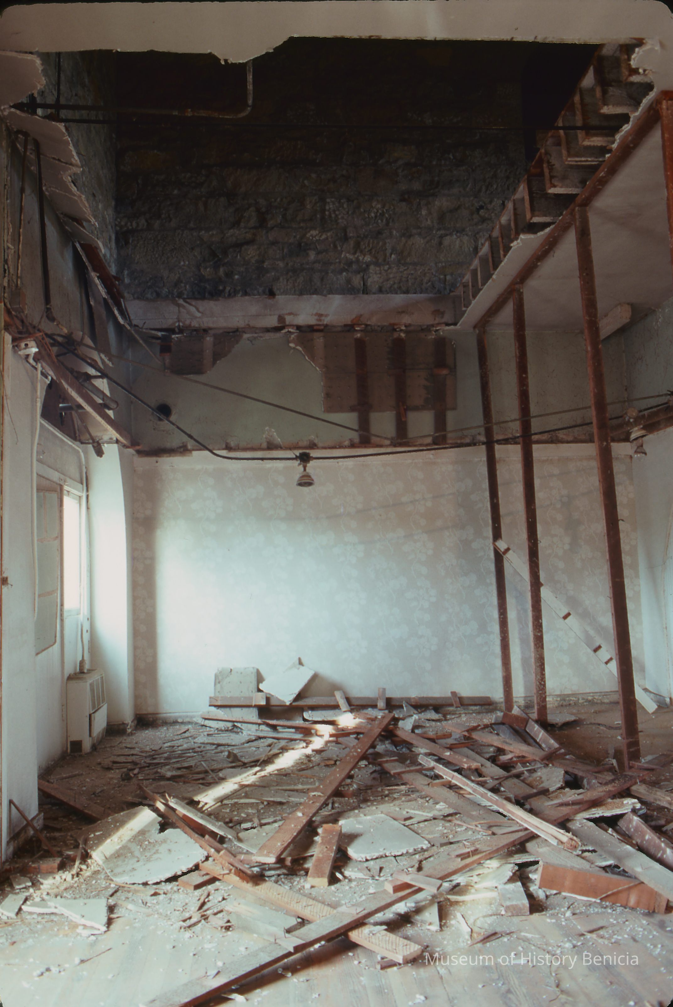 Cutting hole in upper floor to build stairway to upstairs in Bldg.9 during modification to establish museum.