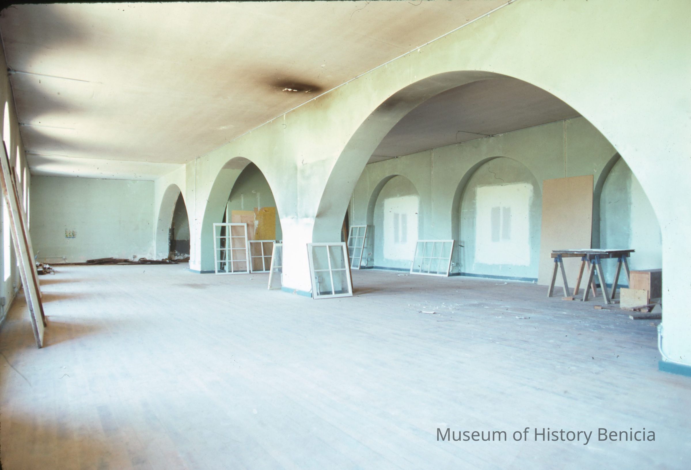 Bldg. 9 downstairs after windows were blocked during modification to establish museum. 35 mm slide.