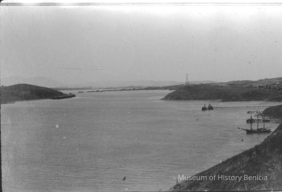 B/W 35mm Slide - west to east view toward Benicia, Glen Cove is in foreground; a three masted ship is at anchor in the cove.