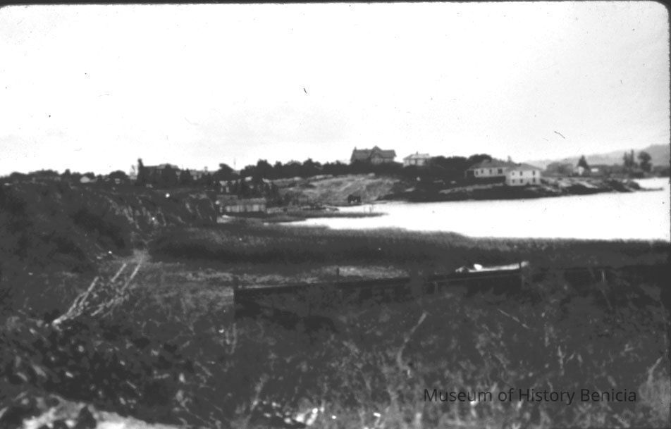 B/W 35mm Slide - shoreline view of Benicia West to East from about West Fourth Street; Carquinez Strait is at right