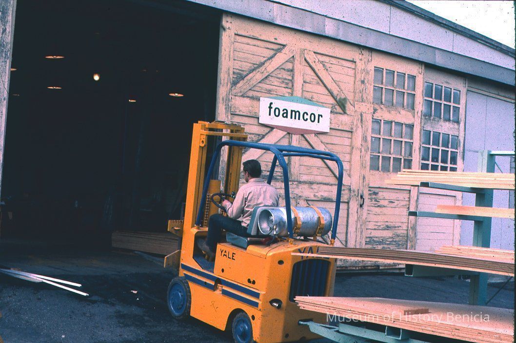 35mm Color Slide: shows operator of a forklift going into the foamcor building.