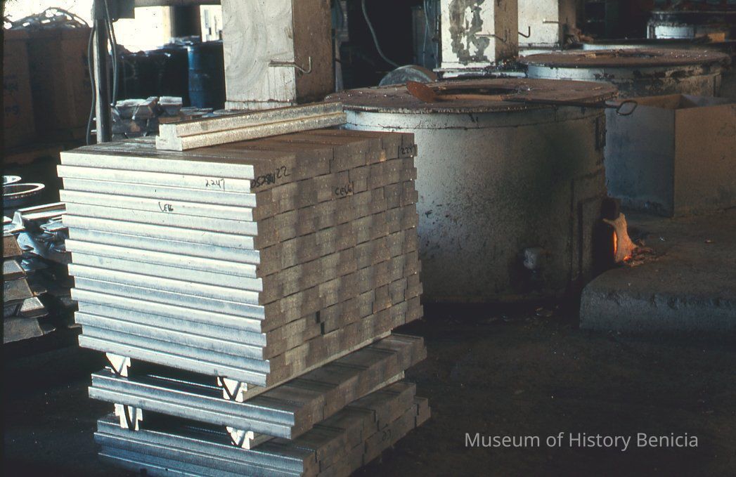 35mm Color Slide: International Mfg. Co. warehouse, metal material stacked on pallets next to ovens/refining equipment