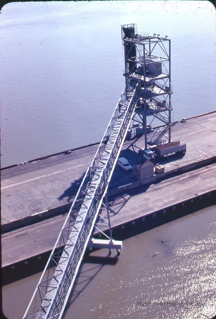35mm Color Slide: according to caption on the holder: "Tower and conveyor for Petr. coke" view from top of the silo