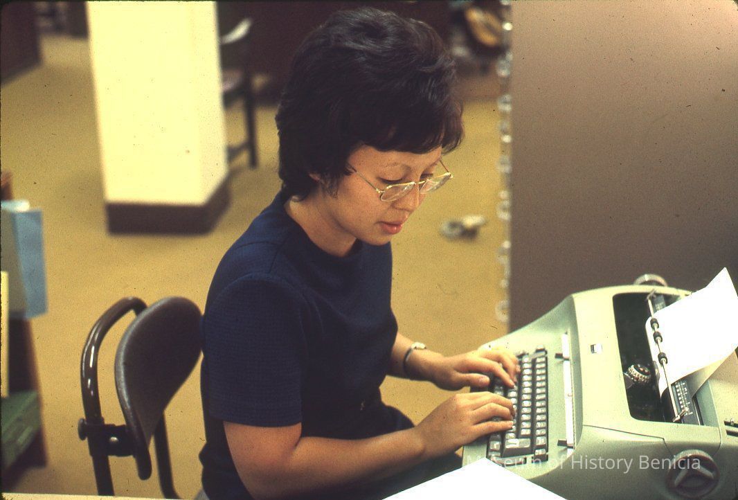 35mm Color Slide: shows Janice Tougas (per caption on holder) working at an unidentified business in the Industrial Park