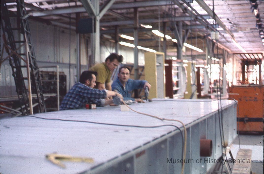 35mm Color Slide: shows three unidentified men behind a piece of machinery in an unknown business