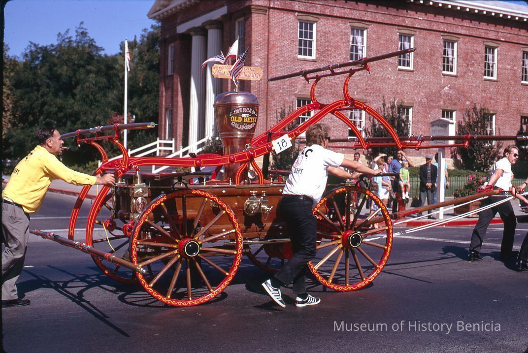 35mm Color Slide: shows entry from Merced in the 1972 Firemen's Muster Parade. The crew is pushing the wheeled pumper up First Street.Collection