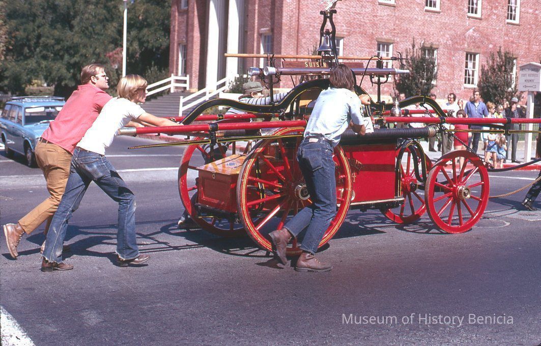 35mm Color Slide: shows entry from Suisun City in the 1972 Firemen's Muster Parade. The crew is pushing the wheeled pumper up First Street.Collection