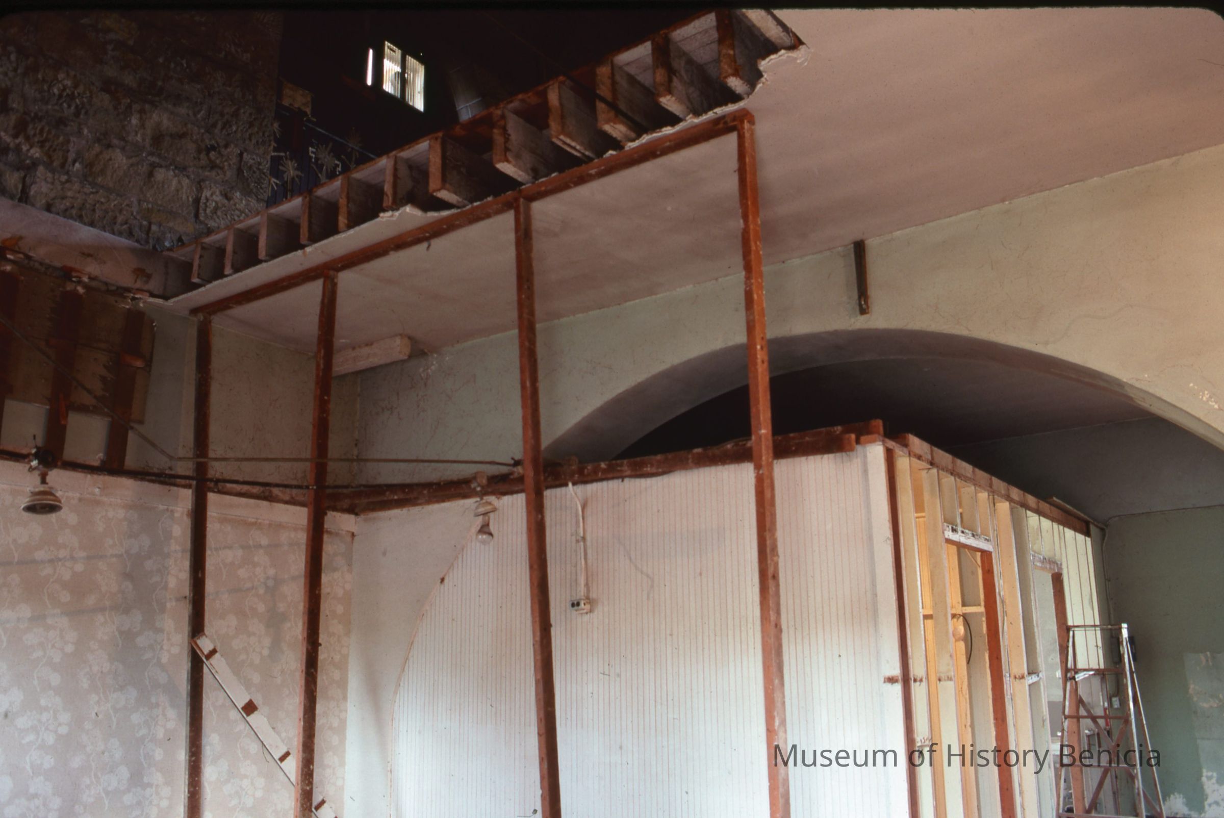 35 mm slide showing detail of construction of stairway to upstairs, Bldg. 9, during modification to establish museum.