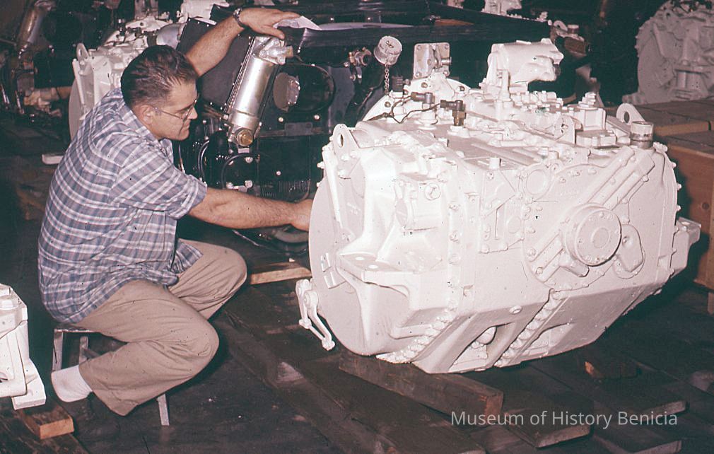 Slide taken by Mrs Cowell of men working on engines at the Benicia Arsenal.