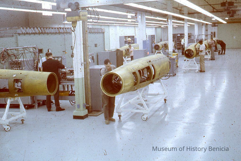 Slide of a missile in a building probably at Benicia Arsenal. Slide is in a metal holder with glass on one side.