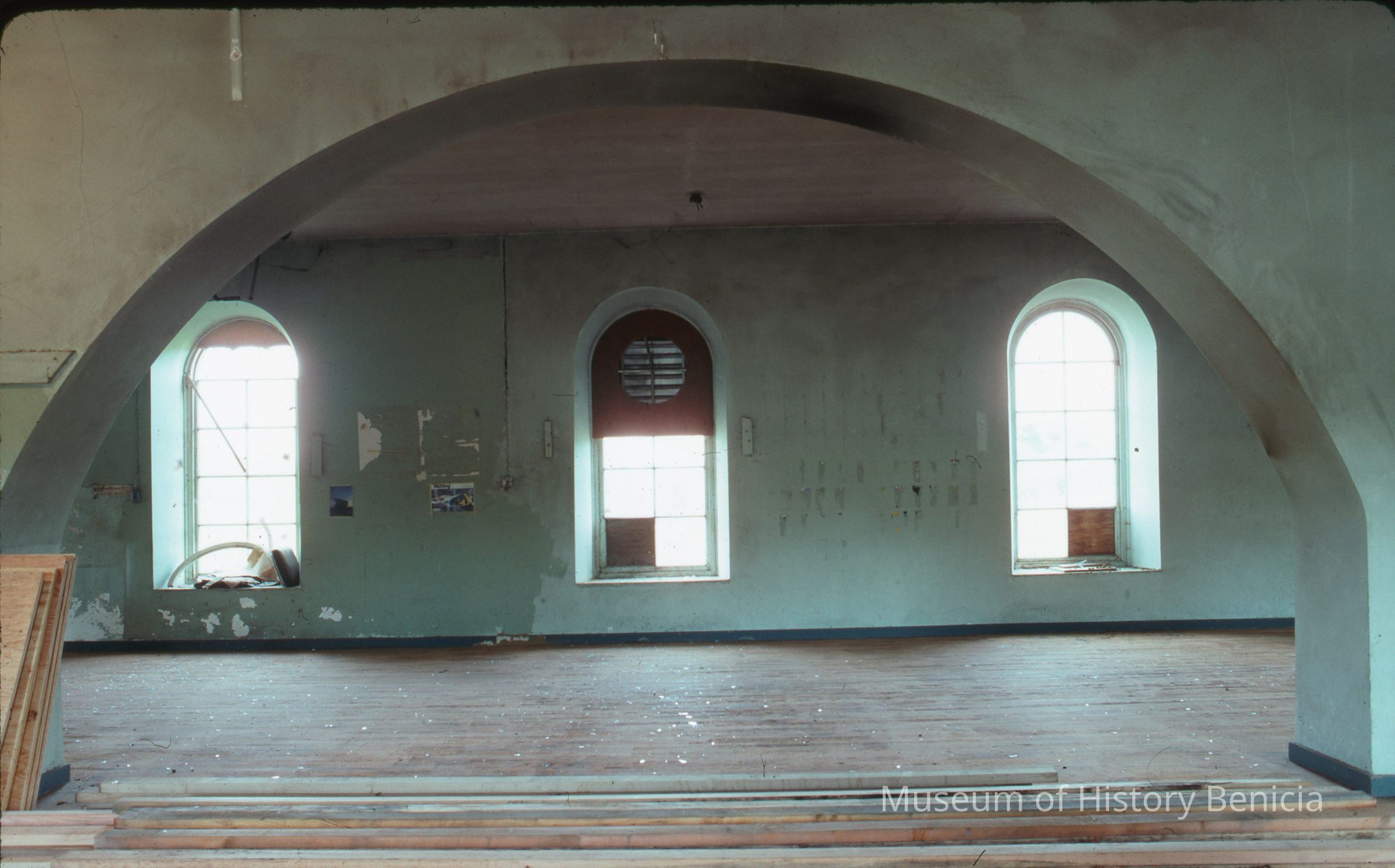 Downstairs Bldg. 9 overview of window replacement needed during modification to establish museum. 35 mm slide.