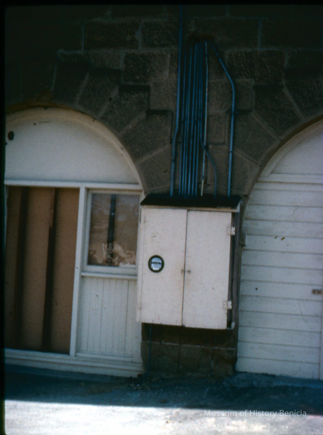 Original doors Bldg. 9 downstairs inside lower floor prior to modification to establish museum. 35 mm slide.
