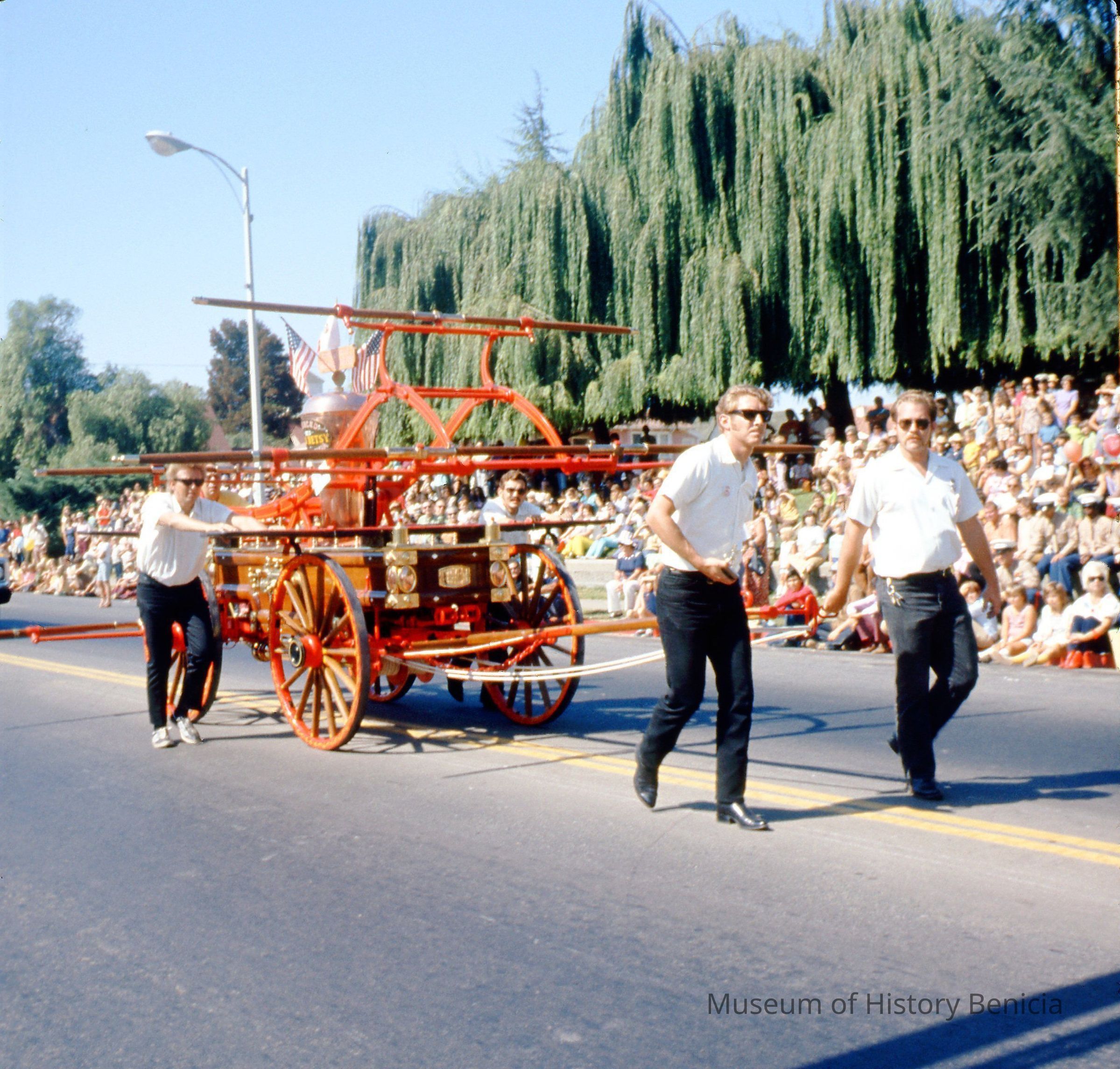 Shown is an unidentified group of firemen pushing and pulling an old pumper in the parade as it passes City Park.Collection
