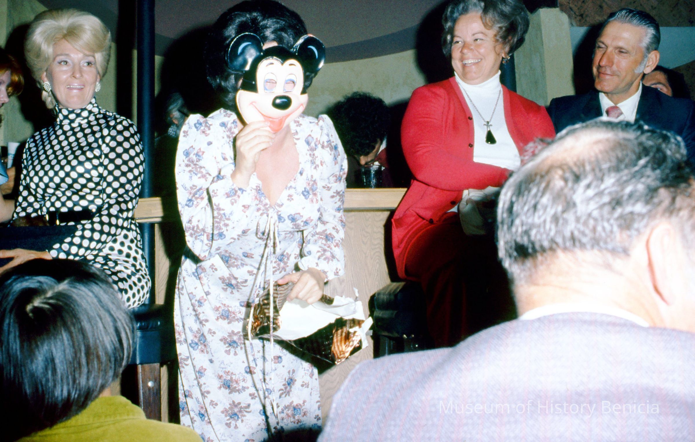 People are not identified. A women is shown holding a Mickey Mouse mask in front of her face.Collection