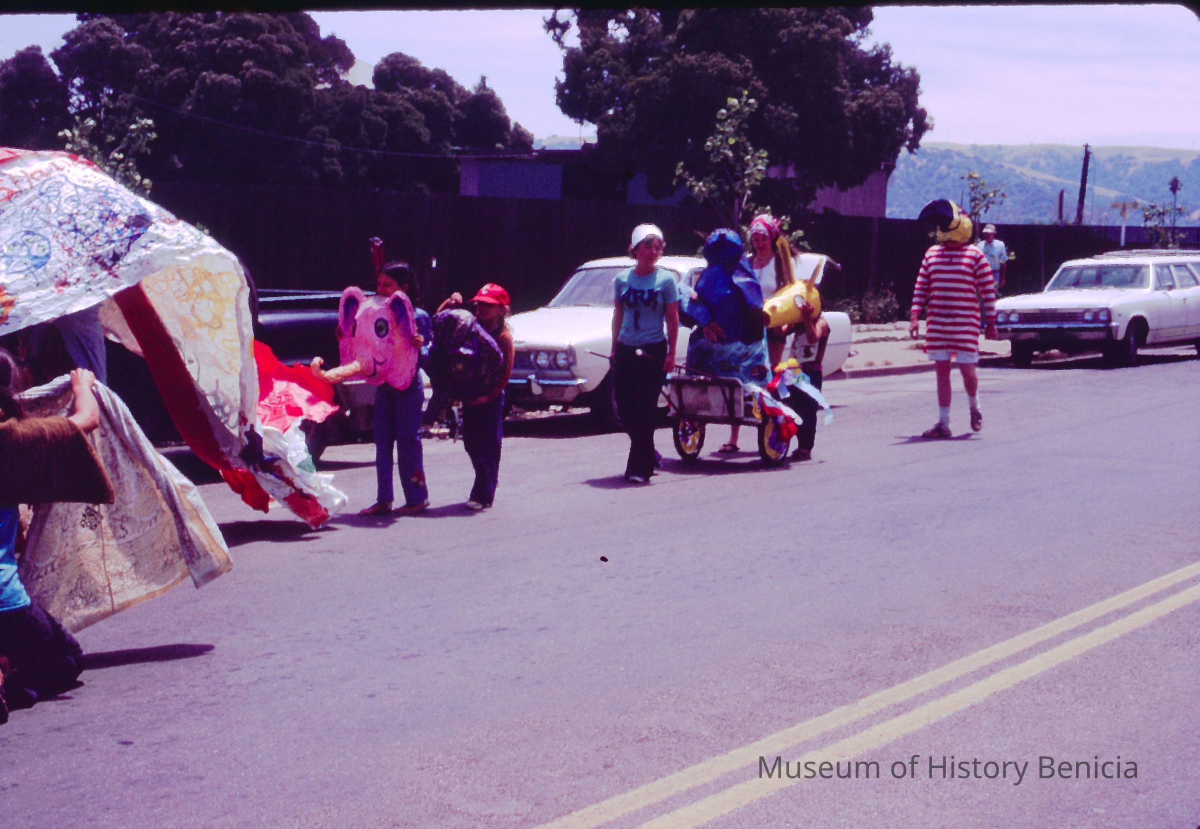 35mm Color Slide: Promotion for Art Center held on First Street Benicia: shows a parade of people on First Street with papier mache headsCollection