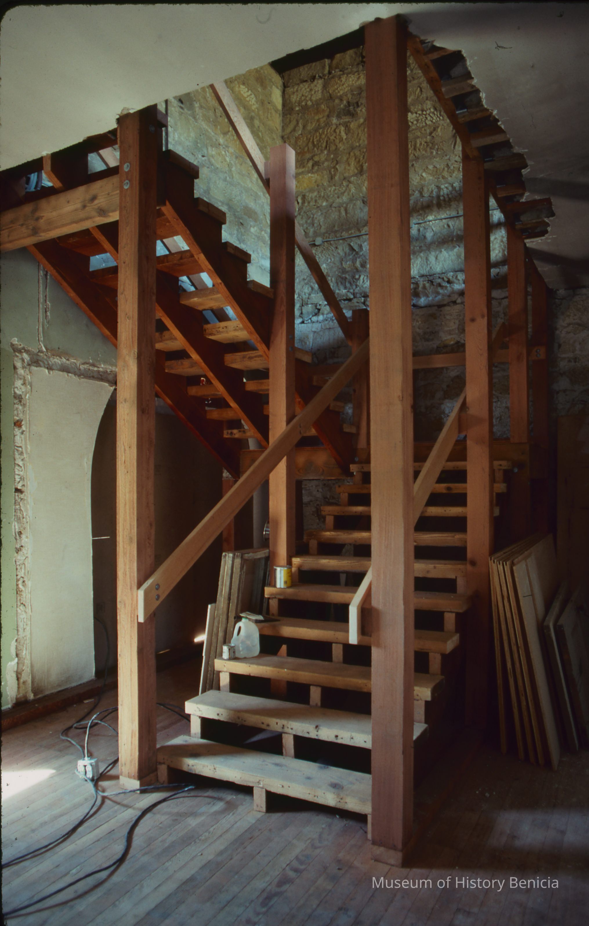 Finished stairway to upstairs in Bldg. 9 during modification to establish museum. 35 mm slide.