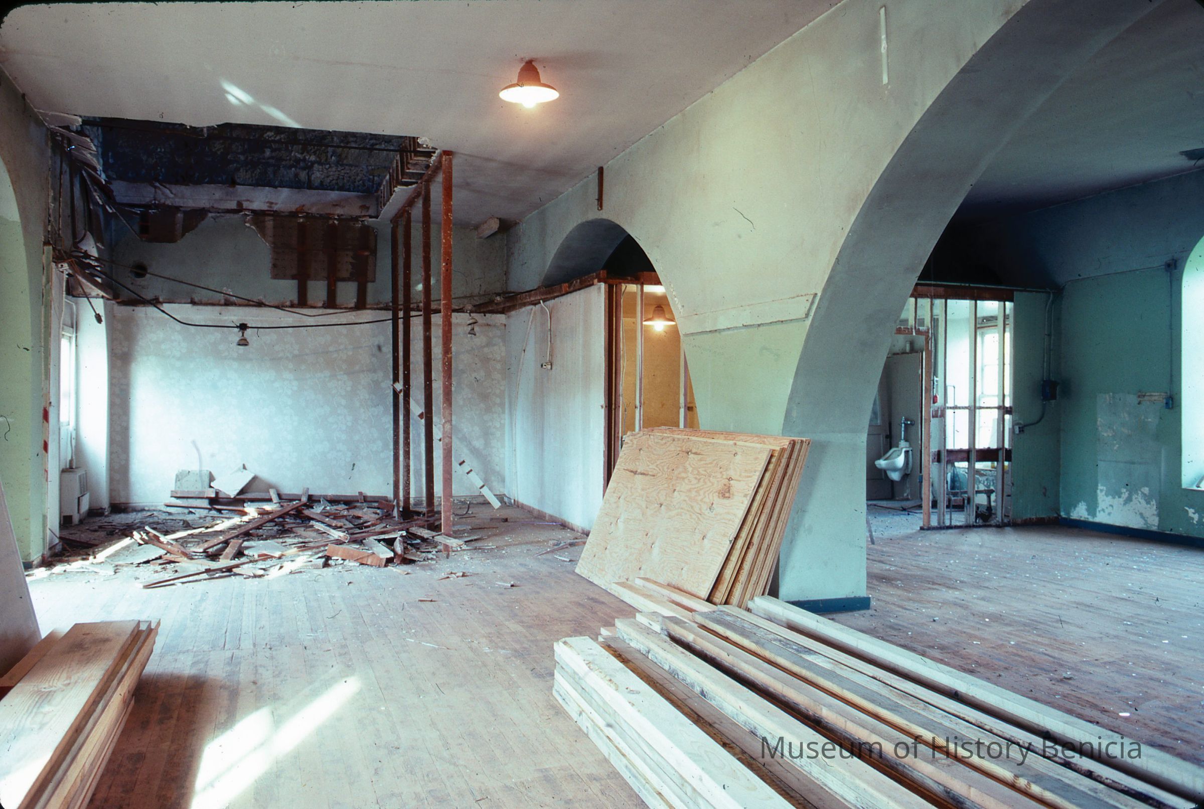 35 mm slide of materials for stairway to upstairs taken from ground floor, Bldg. 9, during modification to establish museum.