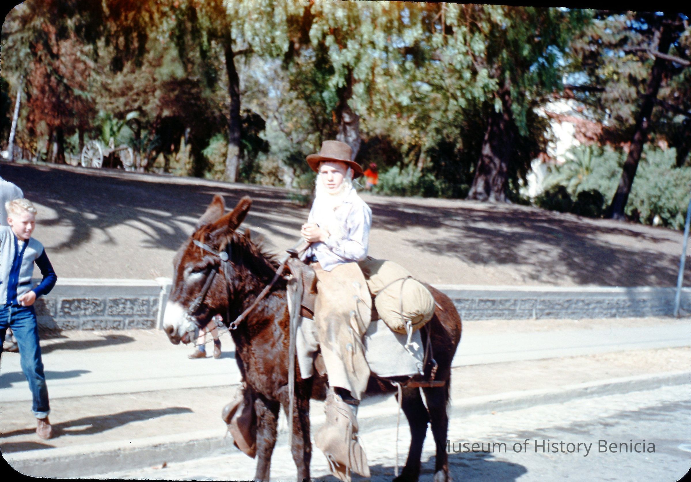 A young man dressed as a miner is shown riding a mule.Collection