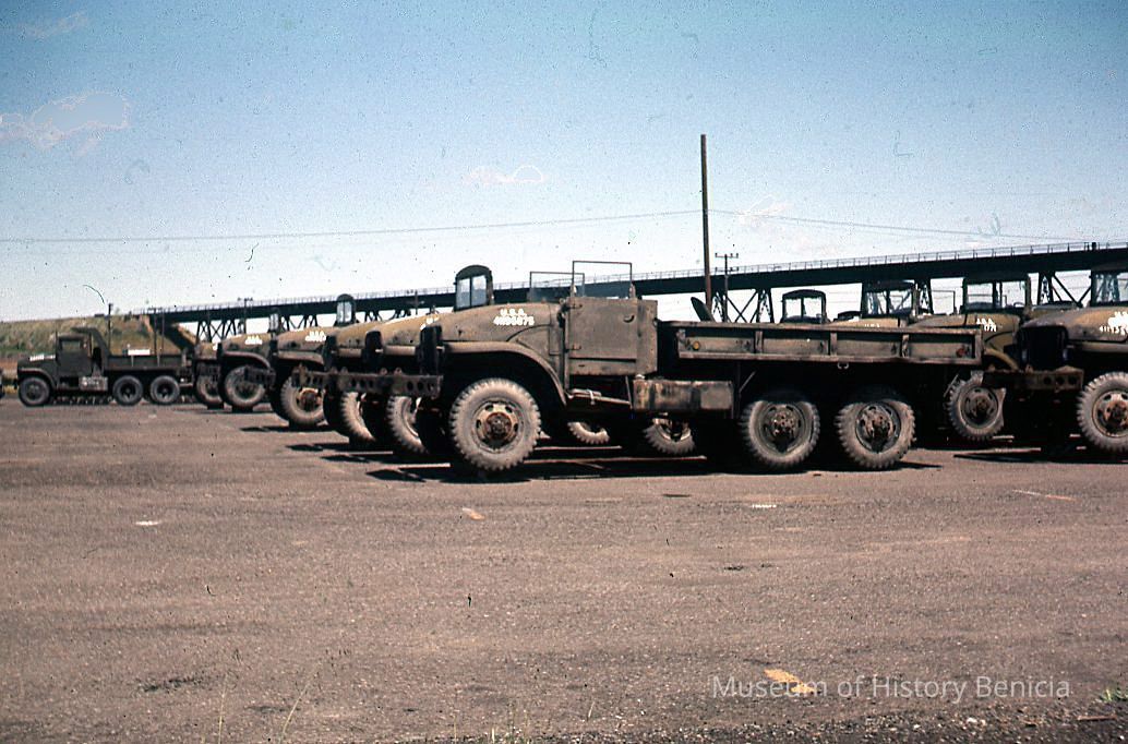 Slide taken by Mrs Cowell of trucks at the Benicia Arsenal.