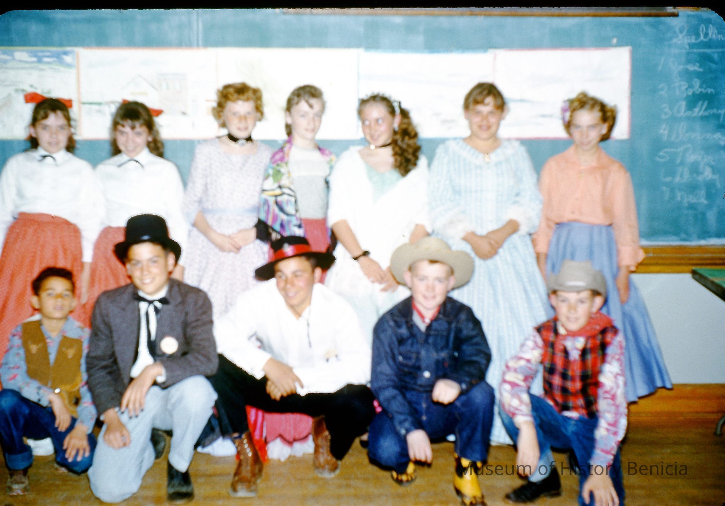 35mm Color Slide: costumed school children who participated in the rededication of the Benicia State Capitol; a large group of mostly unidentified students in a classroom.