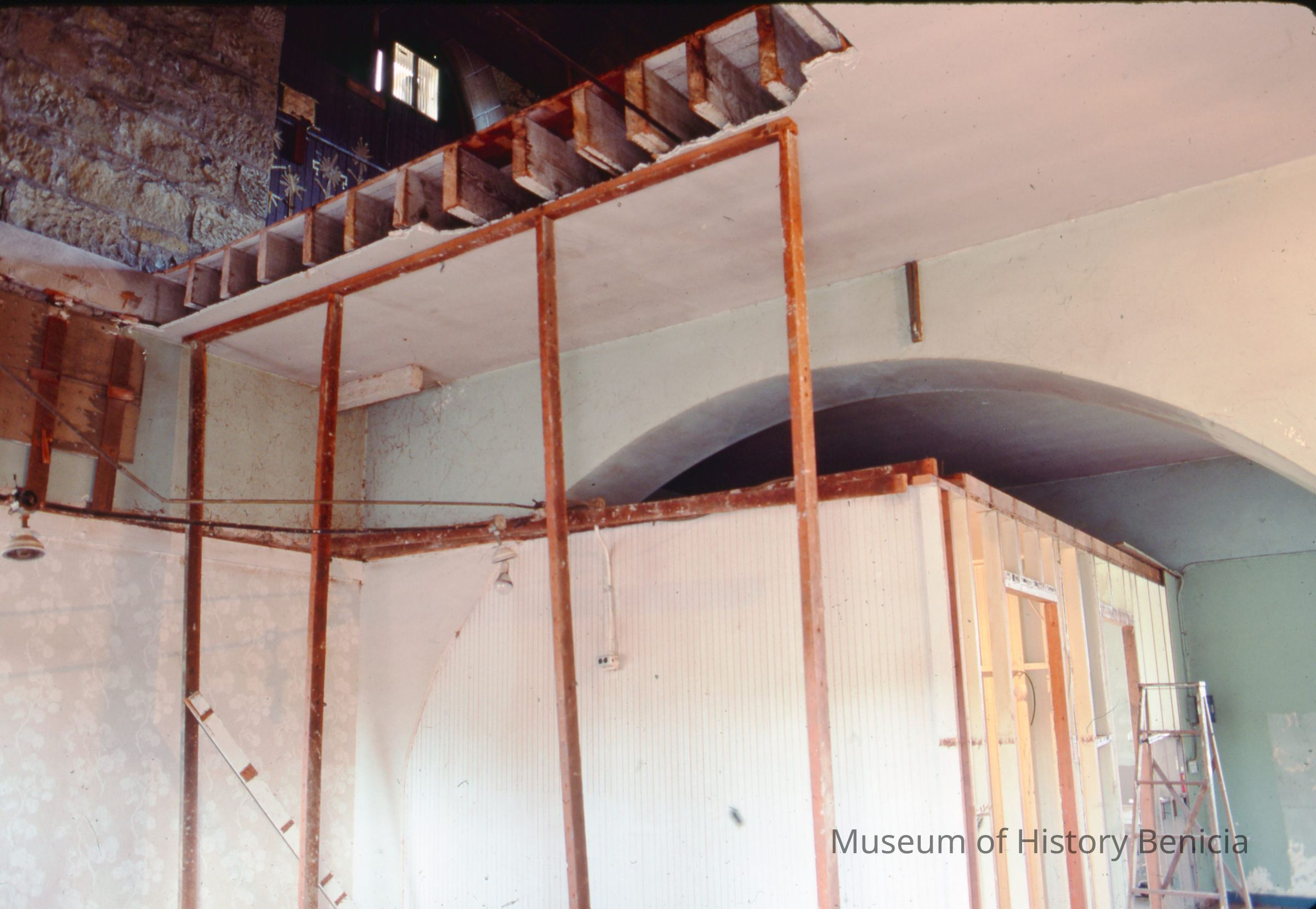 35 mm slide showing detail of construction of stairway to upstairs, Bldg. 9, during modification to establish museum.
