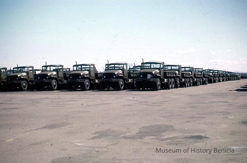 Slide taken by Mrs Cowell of Jeeps at the Benicia Arsenal.
