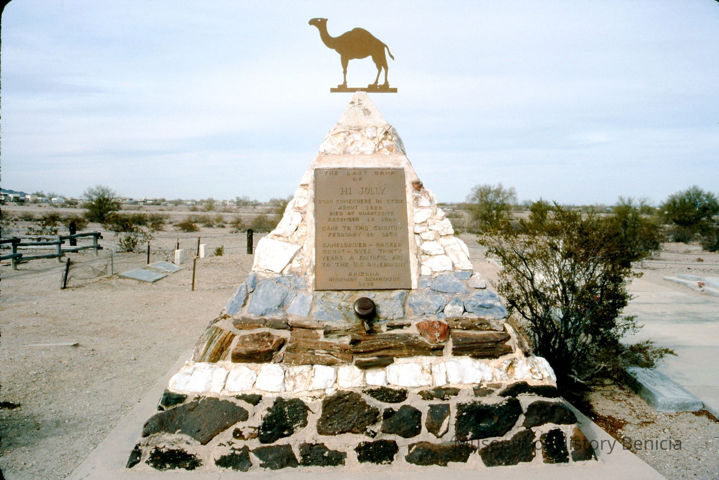 35 mm color slide: written on the cardboard mounting: "The Hi-Jolly Memorial, Quartsite, Arizona". It shows a camel figure on top of a pyramid of various types of stone with a plaque on the front.Collection