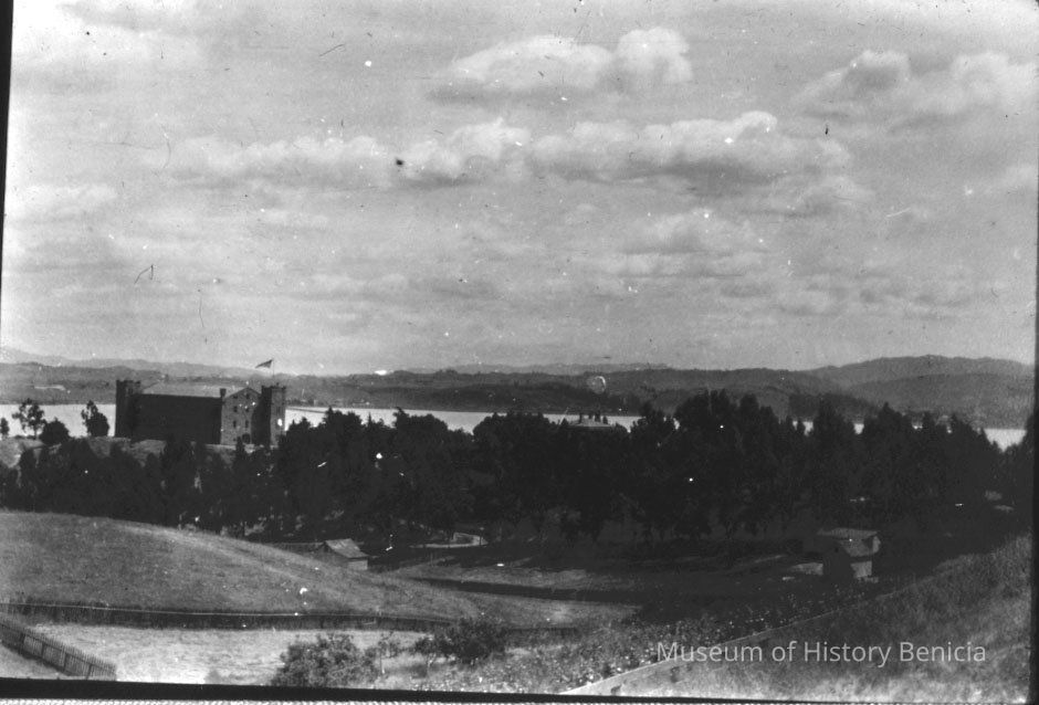 B/W 35mm Slide - looking south to the Clock Tower (prior to the explosion) at left, Carquinez Strait and Contra Costa County Hills in background.Collection