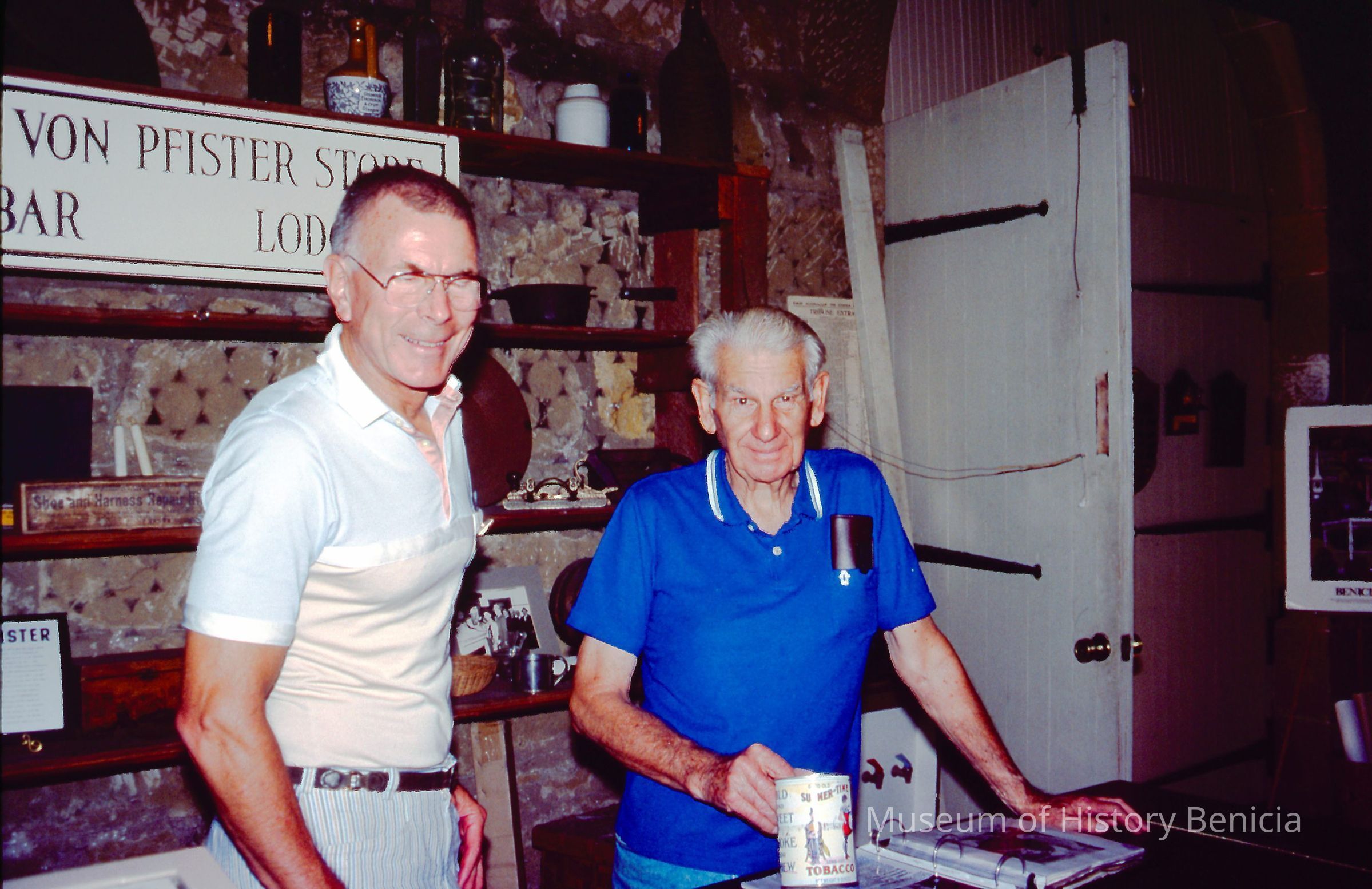 Jim Moor & Paul Spenger at von Pfister exhibit, August 1992. Color slide.